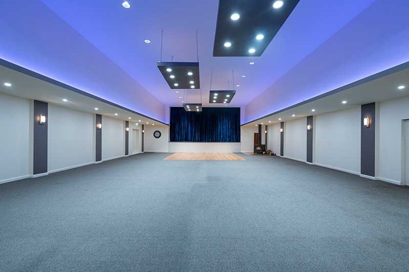 The Great Hall is the largest building of the Tarraleah township, with a commanding presence just off the main square.  The Hall has two log fires, a curtained stage, a dance floor, an impressive ceiling height and a selection of different coloured lighting themes available.  This space is very versatile and ideal for conferences, workshops, grand banquets and gala dinners.  It holds 120 people theatre style and up to 120 for a Banquet.